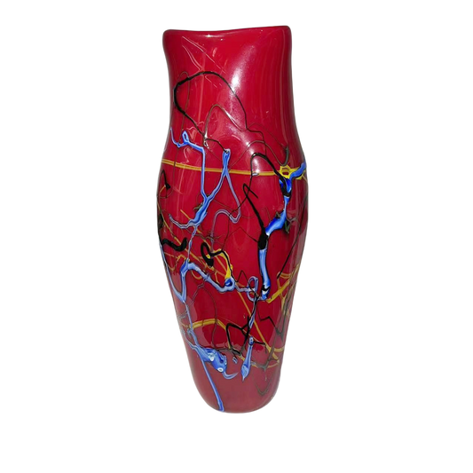 Red blue orange handmade hand blown ripple line art pop art flat heavy colored glaze glass vase 26cm